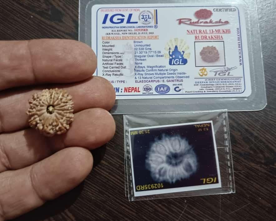 13 mukhi Rudraksha is the form of the king Indra. Lord Indra becomes happy, if it is worn. It gives riches. If a man wears, he is upgraded, his honour increases. It fulfills all the earthly desires and gives eight accomplishments (Siddhies), and the god cupid (Kamdeva) pleases with the man who wears it. “Kartikeya samo gyeye sarva Kaamarth Sidhidah.” This Rudraksha provides all attainments connected with chemical science. The researchers of medical science reach new horizons of success by wearing this thirteen face Rudraksha.